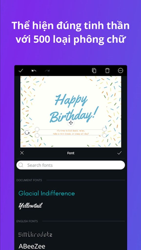 Ứng dụng Canva có thể dễ dàng chèn câu mô tả hình ảnh hay đoạn văn bản. Với hơn 500 loại phông chữ đa dạng tùy ý lựa chọn.