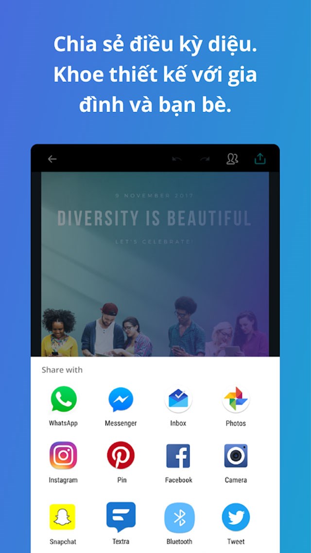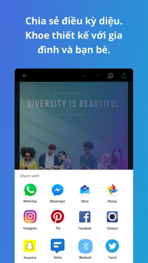 Sau khi thiết kế hoàn tất, bạn có thể chia sẻ thiết kế của mình cho người thân, gia đình và bạn bè thông qua các mạng xã hội như Instagram, Facebook, Tweet,…