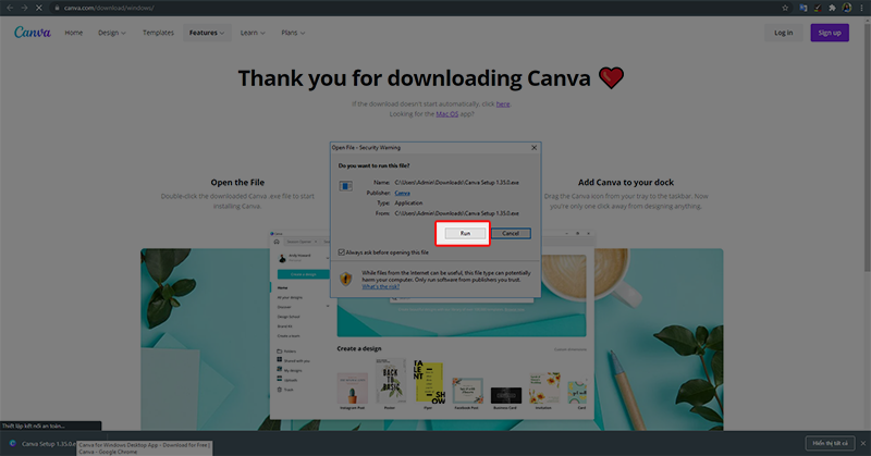Bước 3: Chọn Run để tiến hành cài đặt ứng dụng Canva