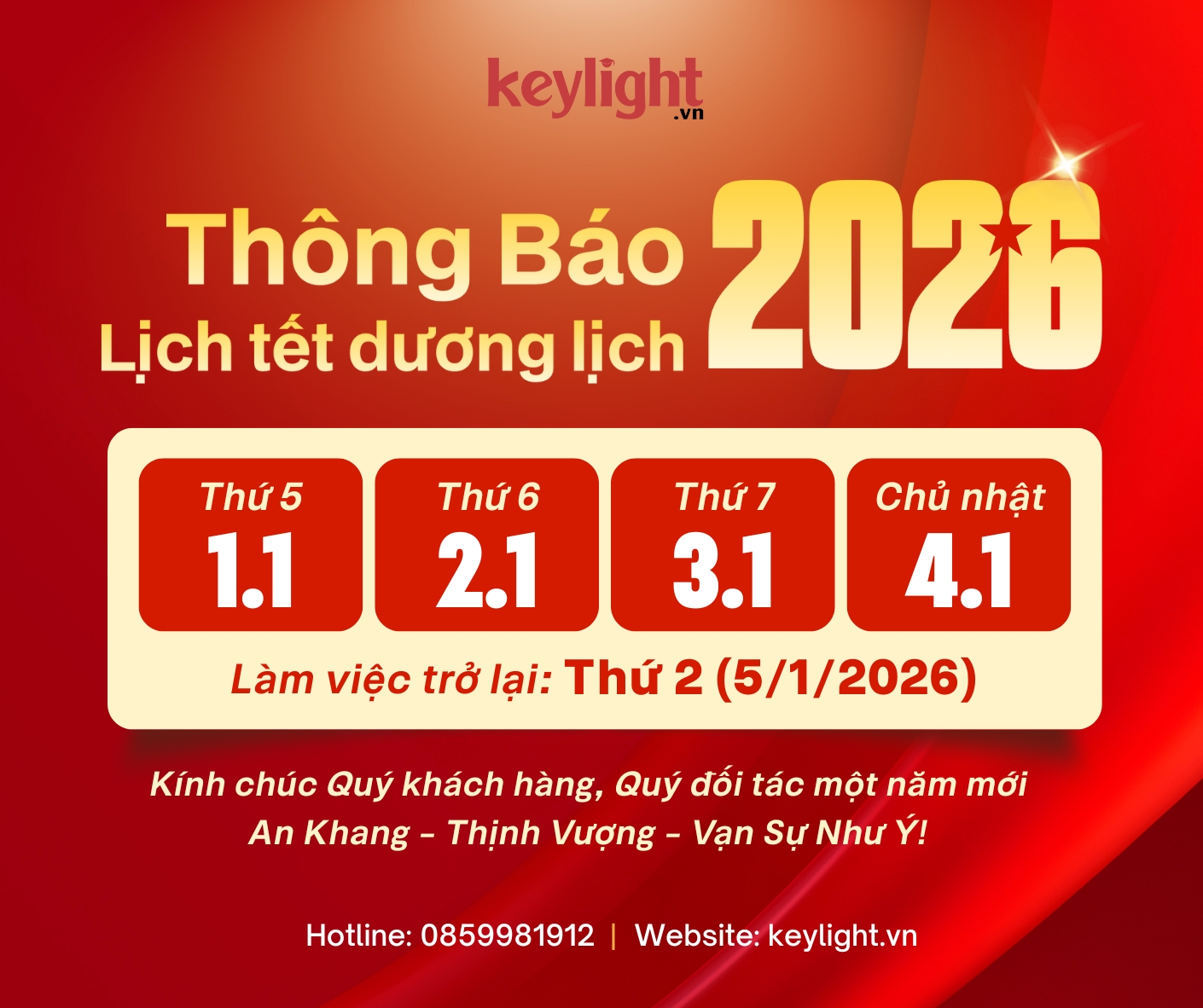 KEYLIGHT.VN THÔNG BÁO LỊCH NGHỈ TẾT DƯƠNG LỊCH 2026